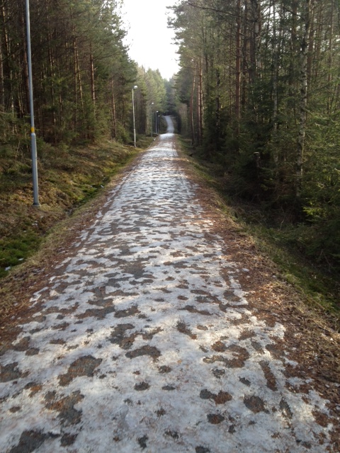 I lördags sprang jag på asfalt, hemma från dörren bara, orkar inte springa när det bara är is. Kan det inte bli vår snart och kan inte låret bli bättre?!?